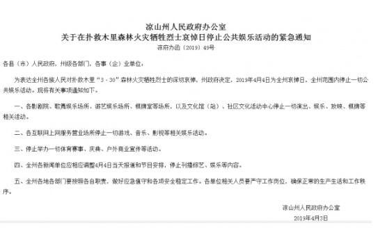 关于在扑救木里森林火灾牺牲烈士哀悼日停止公共娱乐活动的紧急通知