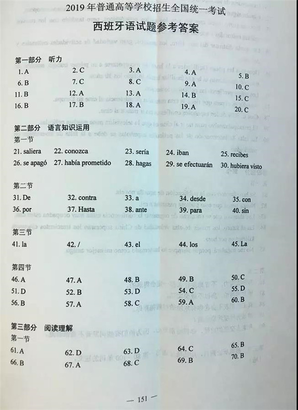 2019全国卷一高考考试于6月7-8日进行,以下是2019全国卷一高考西班牙语参考答案(官方版),供参考。新东方在线高考网小编祝同学们考得好成绩,高考加油。