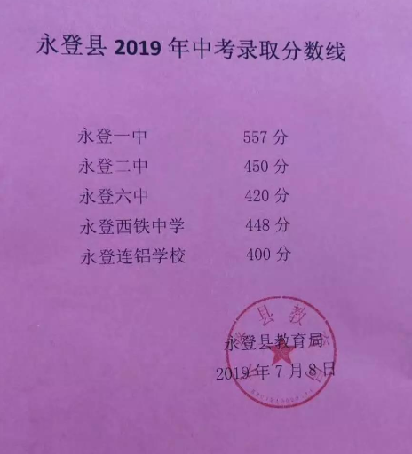 2019年甘肃兰州永登县中考录取分数线公布了,具体内容如下所示: