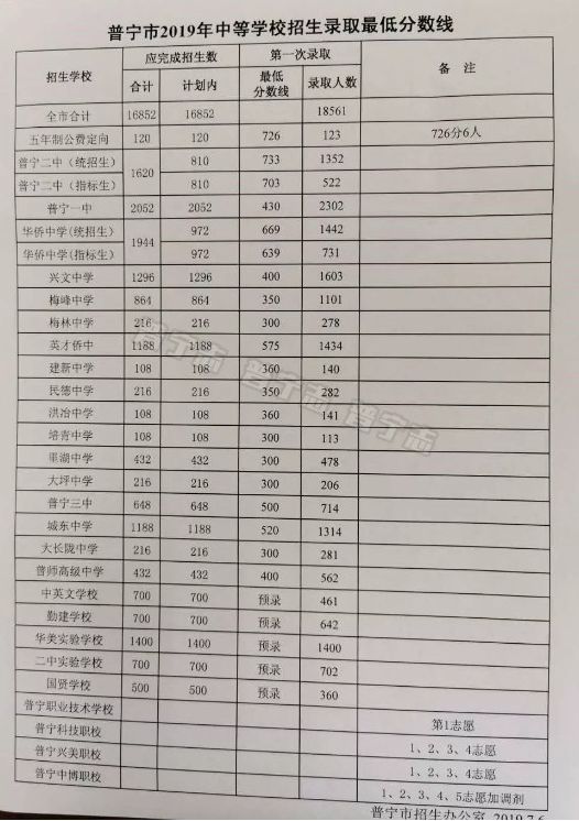 广东普宁2019中考录取分数线