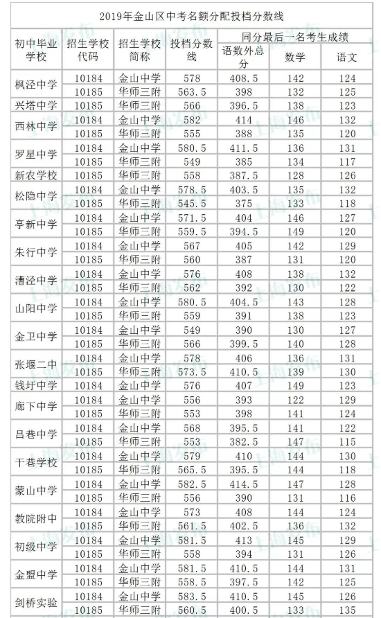 2019上海市金山区零志愿名额分配投档分数线