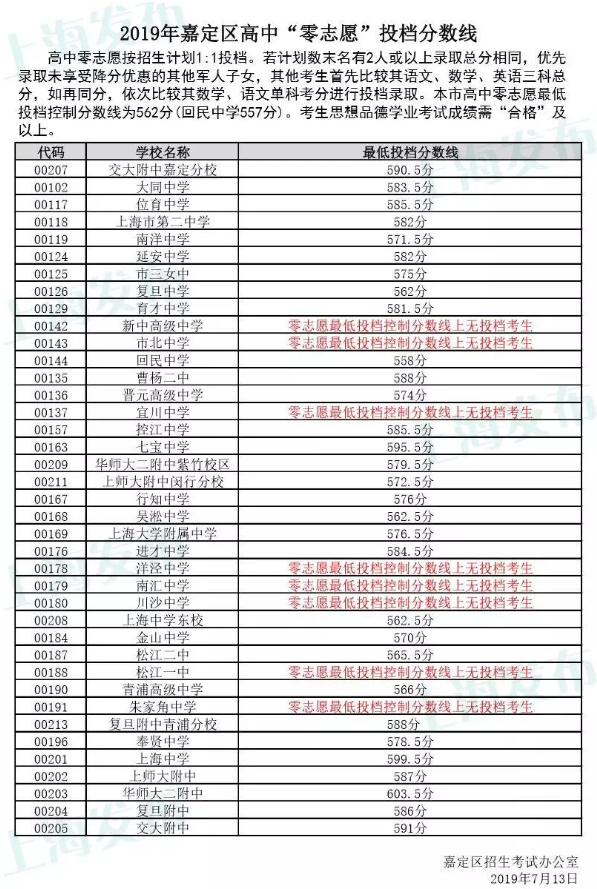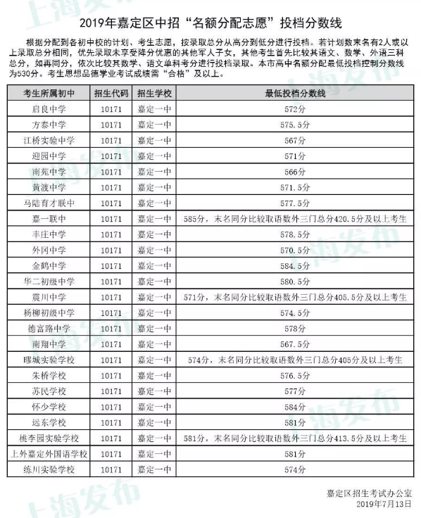 新东方在线中考网整理了《2019上海市嘉定区零志愿名额分配投档分数线》,供同学们和家长参考。
