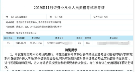 2019年11月30日-12月1日举行证券一般从业和专业资格考试,准考证打印时间:11月25日15点-12月1日16点。本次开考金融市场基础知识、证券市场法律法规2个一般从业考试科目,以及保荐代表、证券分析师、证券投资顾问三个专项科目。