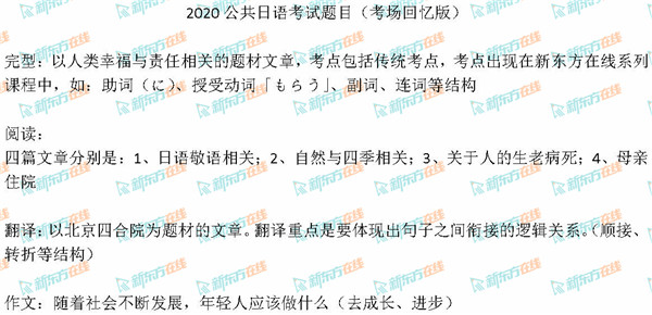 2020考研公共日语考试已经结束了,小编整理了2020考研公共日语真题及答案:完型|阅读|翻译|作文,希望对21备考生们有所帮助,同时也提醒本届考生,接下来要为2020考研复试做准备,2月份将可以查分,千万不要错过。