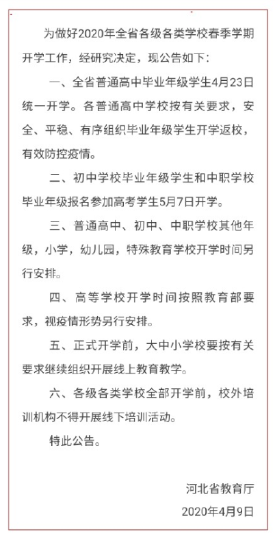河北省教育厅发布关于2020年春季学期开学时间的公告: