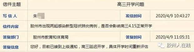 近日,有网友从胶州政务网了解到,受疫情影响,胶州高三开学时间延迟,具体开学时间将重新评估。此前,山东省教育厅曾发布通知,要求高三年级4月15日正式开学。