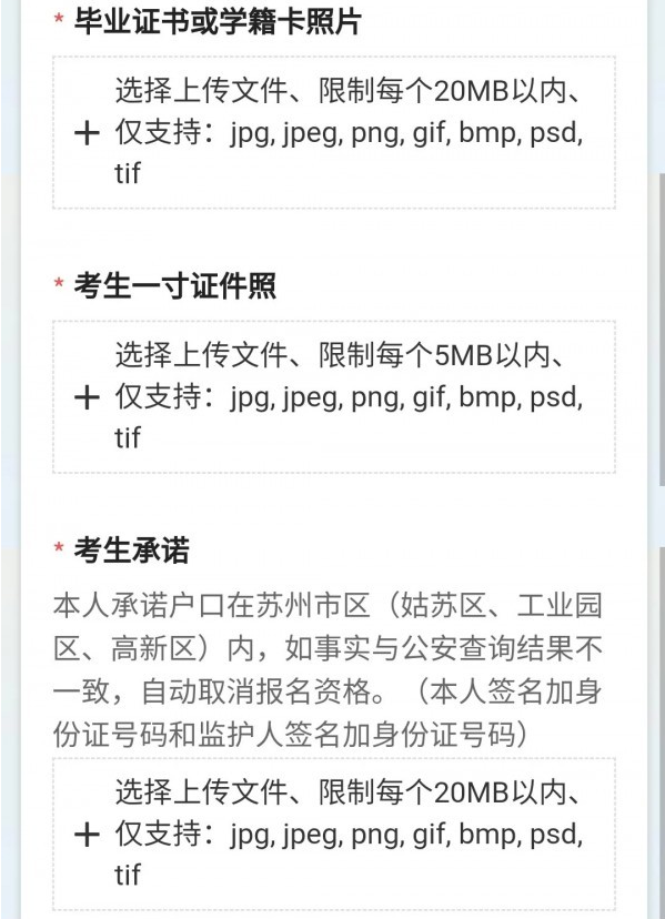 3.往届生准备初中毕业证书电子稿(20MB以内),应届返苏生准备学籍卡电子稿(20MB以内)。学籍卡可向学籍所在学校(苏州大市范围内)索取复印件并盖章。