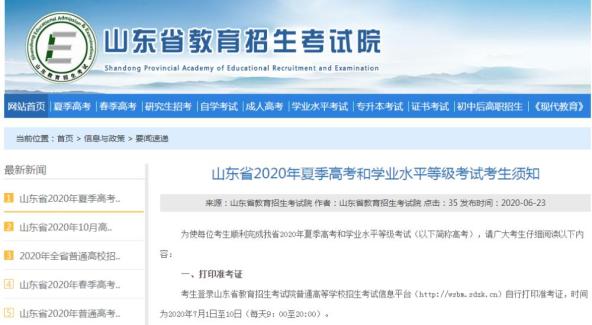 今年的山东高考将于7月7日-10日开考,而2020山东高考准考证打印时间定于7月1日开始,(每天9:00至20:00),届时考生需登录山东省教育招生考试院普通高等学校招生考试信息平台自行打印准考证。