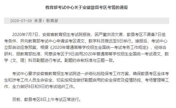 教育部考试中心关于安徽歙县考区考情的通报称,2020年7月7日,安徽省教育招生考试院报告,因严重洪涝灾害,歙县考区不具备7日组考条件,并向教育部考试中心申请该考区语文、数学科目推迟至9日举行。接报后,考试中心立即启动应急预案,根据《2020年普通高等学校招生全国统一考试考务工作规定》,经综合研判,报教育部批准,同意该考区于9日启用2020年普通高等学校招生全国统一考试语文、数学(文、理)科目副题进行考试。副题的命制标准与正题一致。