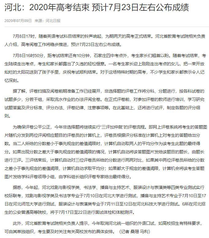7月9日,河北高考已经结束了,据河北日报传来消息,2020河北高考成绩公布时间为7月23日,按惯例也将公布高考录取最低分数线,请河北的考生和家长知晓并关注,接下来就是高考志愿填报了。