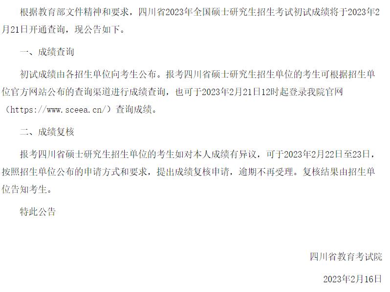 以上就是为大家整理的“四川省2023考研成绩查询入口2月21日12点开放”,希望考生们能够考到理想的成绩,成功上岸!