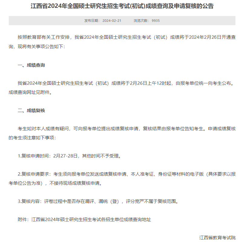 参加江西2024考研的朋友们,根据官方消息,江西2024考研成绩公布时间为2月26日12:00起,可登录考研查分入口查询成绩了。小编及新东方考研名师团队预祝大家,都有一个称心的考研成绩。