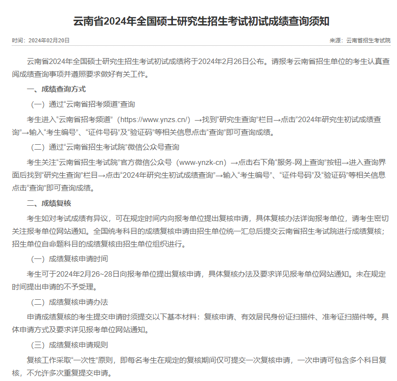 云南2024考研成绩公布时间:2月26日起