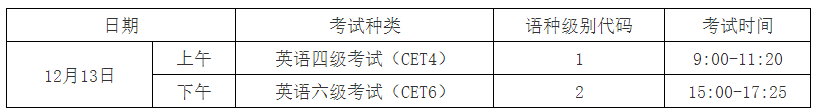 英语四级口语考试(CET-SET4)考试时间为11月22日(F253次),英语六级口语考试(CET-SET6)考试时间为11月23日(S254次)。具体场次安排如下: