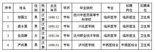 根据《铜仁市市直卫生事业单位2014年公开招聘新增人员工作方案》规定,经过笔试、体检和政审考核,现将铜仁市市直卫生事业单位拟聘用人员进行公示。名单如下: 一、铜仁市人民医院(6...