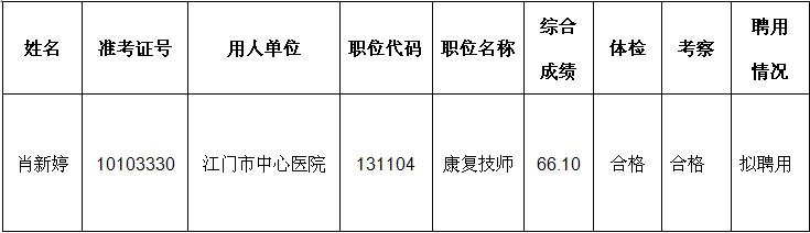 2013年上半年江门市直事业单位公开招聘及三月份专场招聘中,经笔试、面试、体检和考察等程序,肖新婷同志考试综合成绩的名次、体检和考察结果,均符合聘用条件,拟同意聘用,现予以公示...