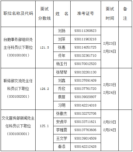 中华全国台湾同胞联谊会2017年考试录用机关工作人员面试公告 根据公务员录用工作有关规定,现就2017年中华全国台湾同胞联谊会录用机关工作人员面试有关事宜通知如下: 一、 面试分数...