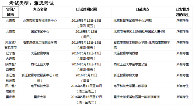 接英国文化教育协会通知,报考2016年5月21日首都师范大学雅思考试的所有考生的口语考试将安排在2016年5月16日(星期一)或者5月17日(星期二)进行,口试场地变更为北京市教育考试指导中心。...