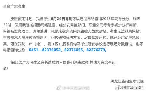 黑龙江考生6月24日零时可以通过网络查询2018年高考分数,但由于网络被恶意攻击,导致考生无法登录网站。 高考查分暂时电话:0451-82376052、82376055、82376279。 24日上午,考试...