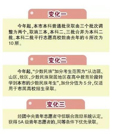 据北京考试报报道,2017年,北京高招实施本科录取批次改革,调整志愿设置,将本科普通批录取由3个调整为2个,取消本科三批,将本科二、三批合并为本科二批。此外,还调整了“少数民族”...