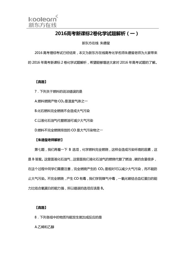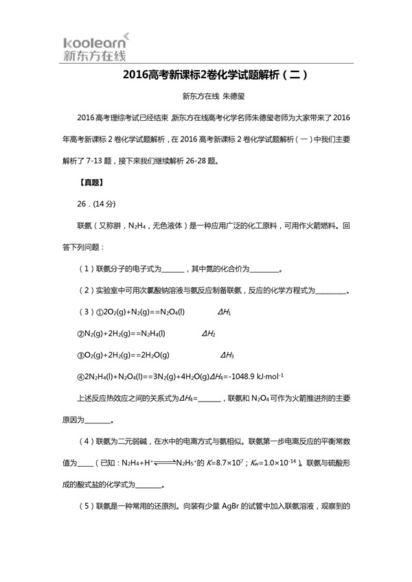 2016年新课标2卷高考化学考试已结束,新东方在线高考网邀请新东方高考名师朱德玺为大家第一时间点评2016年新课标2卷高考化学试题,更多2016高考试题及答案,请查看2016年高考试题及答案...