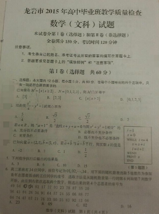 来源 : 网络 05月11日 17:00 关键字 : 2015龙岩质检 龙岩质检文科数学试题 数学答案