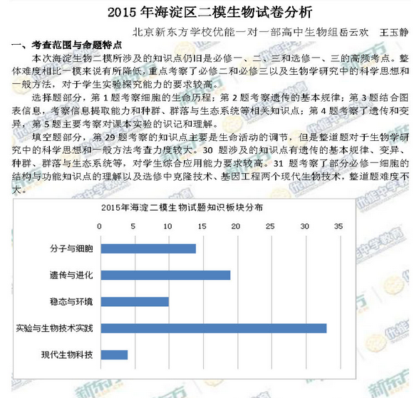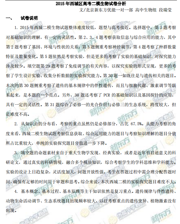 北京市西城区2015届高三二模生物考试已经结束,新东方在线高考网特别整理《新东方名师解析2015西城高三二模生物试题》,供高三考生参考。更多2015年北京高三二模试题及答案请关注新东方...