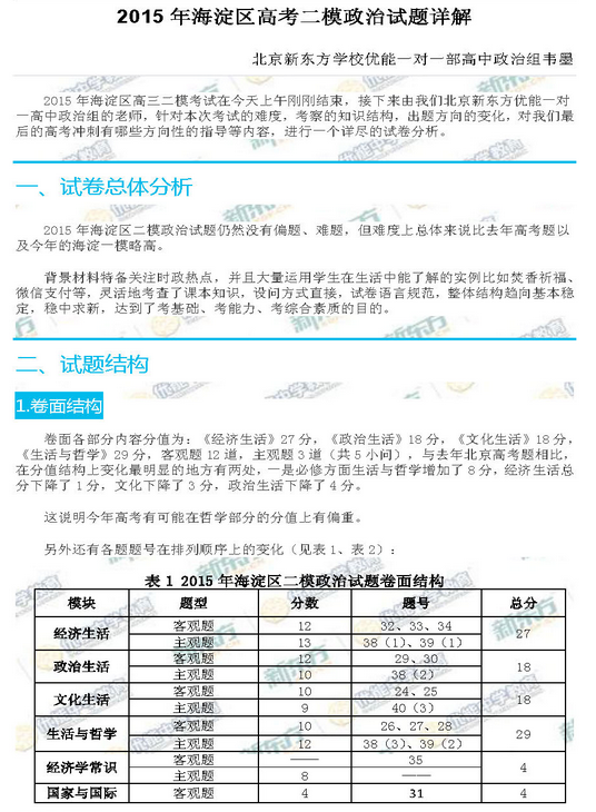 北京市海淀区2015届高三二模政治考试已经结束,新东方在线高考网特别整理《新东方名师解析2015海淀高三二模政治试题》,供高三考生参考。更多2015年北京高三二模试题及答案请关注新东方...