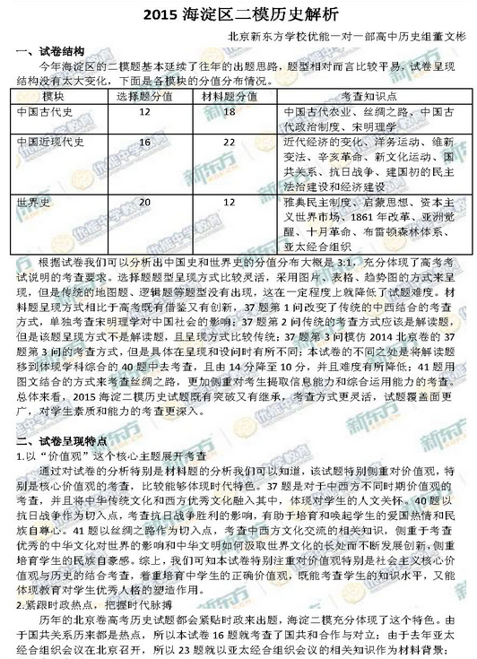 北京市海淀区2015届高三二模历史考试已经结束,新东方在线高考网特别整理《新东方名师解析2015海淀高三二模历史试题》,供高三考生参考。更多2015年北京高三二模试题及答案请关注新东方...