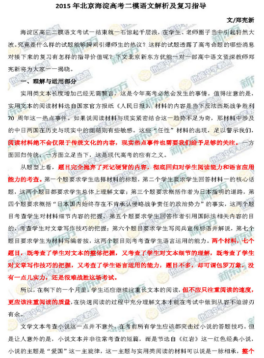 北京市海淀区2015届高三二模语文考试已经结束,新东方在线高考网特别整理《新东方名师解析2015海淀高三二模语文试题》,供高三考生参考。更多2015年北京高三二模试题及答案请关注新东方...