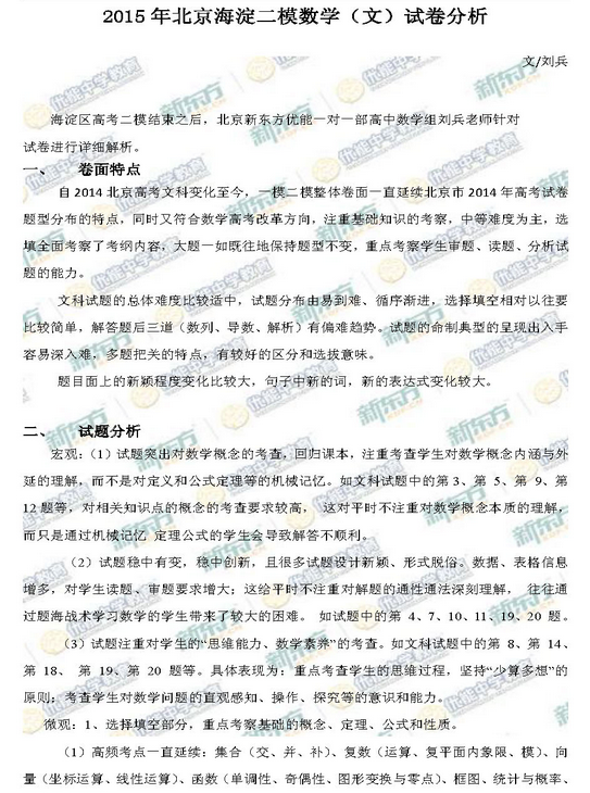 北京市海淀区2015届高三二模文科数学考试已经结束,新东方在线高考网特别整理《新东方名师解析2015海淀高三二模文科数学试题》,供高三考生参考。更多2015年北京高三二模试题及答案请关...