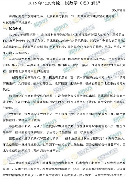 北京市海淀区2015届高三二模理科数学考试已经结束,新东方在线高考网特别整理《新东方名师解析2015海淀高三二模理科数学试题》,供高三考生参考。更多2015年北京高三二模试题及答案请关...