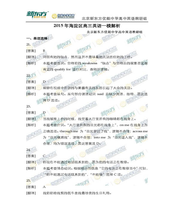 来源 : 网络 04月09日 17:33 关键字 : 新东方 海淀2015高三英语一模 2015高三一模