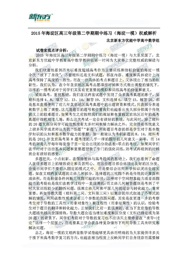 北京市海淀区2015届高三数学一模考试与4月8日、9日开考,新东方在线高考网特别整理《新东方名师解析北京海淀2015高三一模试题》,供高三考生参考。更多2015年北京高三一模试题及答案、20...
