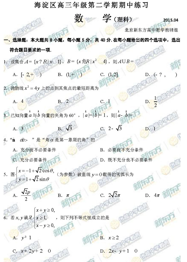 来源 : 网络 04月08日 17:58 关键字 : 新东方 海淀高三理数一模 2015高三理数一模