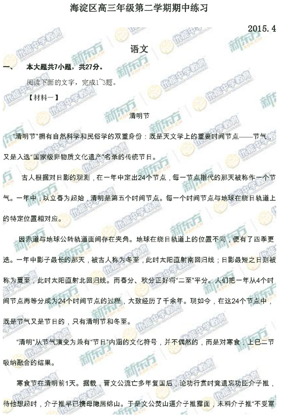 推荐阅读:2016北京海淀区高三一模试题及答案汇总 2015年北京海淀区高三一模语文考试已经结束,新东方在线高考网第一时间整理《2015年北京海淀区高三一模语文试题及答案》,供高考考生参...