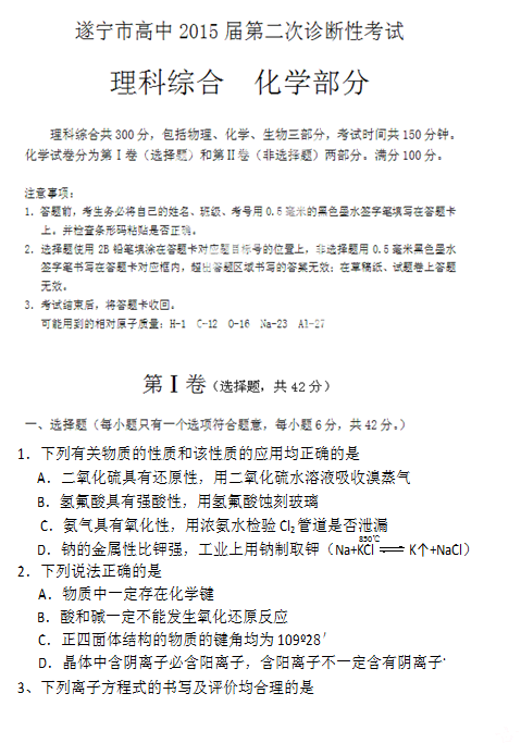 来源 : 网络 03月20日 11:11 关键字 : 2015遂宁二诊 遂宁二诊化学试题及答案