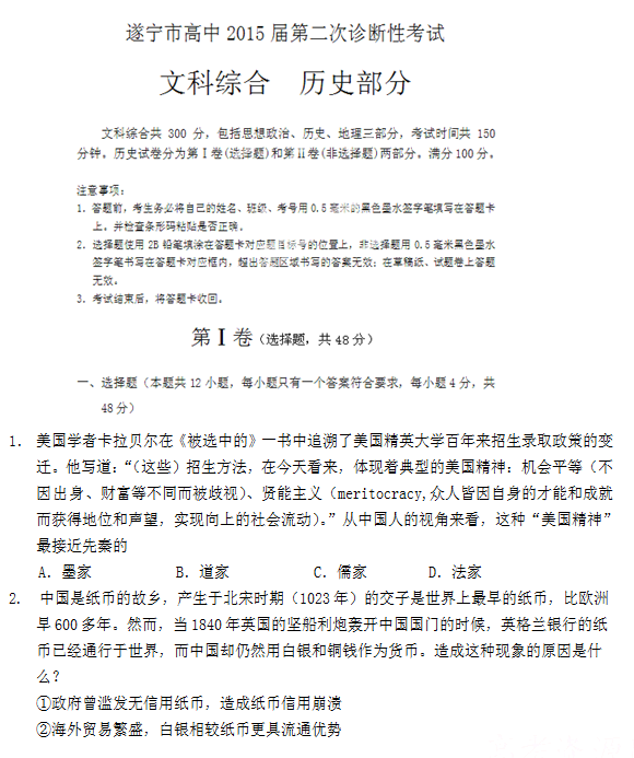 2015年四川遂宁二诊历史考试已结束,新东方在线高考网小编整理了《2015年四川遂宁二诊历史试题及答案》,供同学们参考。2015年四川遂宁二诊紧扣高考大纲,不仅可以检验考生的复习情况,...