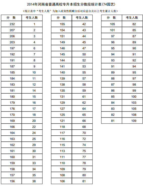 新东方在线讯 河南2014年高考录取分数线现已公布,新东方在线高考网第一时间整理《河南2014年高考专升本成绩分段表统计表(园艺)》,供河南高考考生查询。 河南2014年高考专升本成绩...