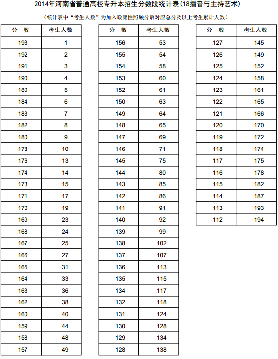 新东方在线讯 河南2014年高考录取分数线现已公布,新东方在线高考网第一时间整理《河南2014年高考专升本成绩分段表统计表(播音与主持艺术)》,供河南高考考生查询。 河南2014年高考...