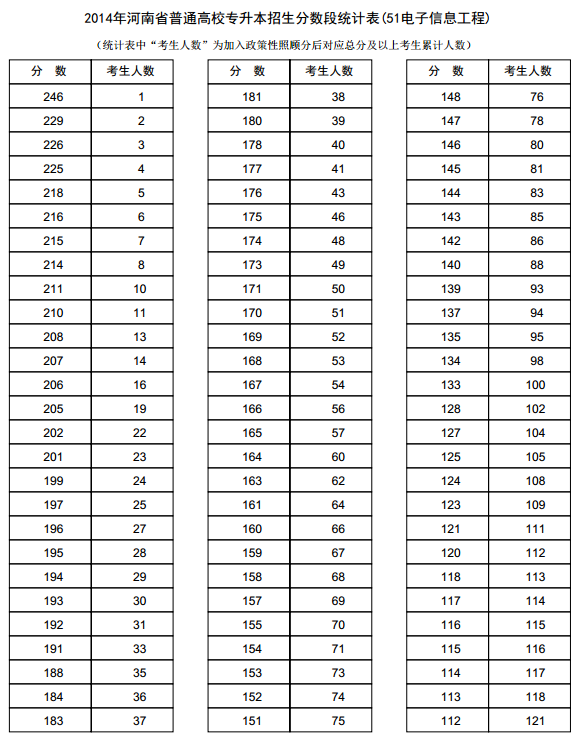新东方在线讯 河南2014年高考录取分数线现已公布,新东方在线高考网第一时间整理《河南2014年高考专升本成绩分段表统计表(电子信息工程)》,供河南高考考生查询。 河南2014年高考专...