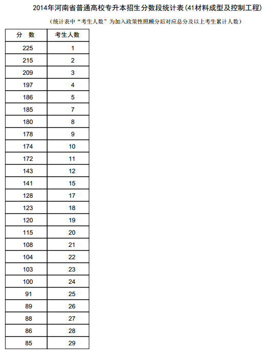 新东方在线讯 河南2014年高考录取分数线现已公布,新东方在线高考网第一时间整理《河南2014年高考专升本成绩分段统计表(材料成型及控制工程)》,供河南高考考生查询。 河南2014年高...