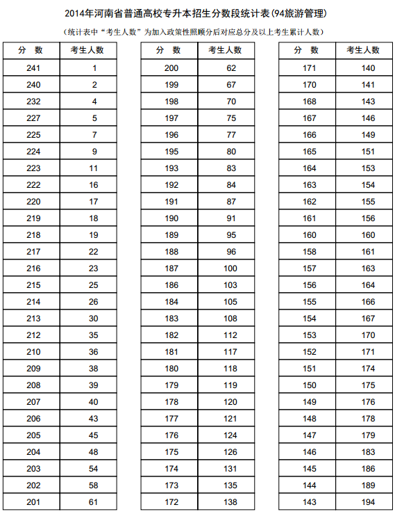 新东方在线讯 河南2014年高考录取分数线现已公布,新东方在线高考网第一时间整理《河南2014年高考专升本成绩分段表统计表(旅游管理)》,供河南高考考生查询。 河南2014年高考专升本...