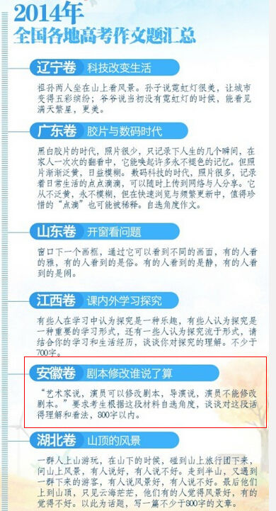 2014年6月7日上午12点许,全国高考第一科语文结束,各地作文题汇总火热出炉!而安徽的高考题目取材于娱乐新闻,以数月前宋丹丹和编剧的剧本之争为北京,让学生谈理解和看法。 2014年安...