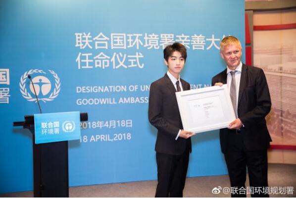 4月18日上午,联合国副秘书长兼环境署执行主任埃里克·索尔海姆为中国青年偶像王俊凯授予“联合国环境署亲善大使”称号。 图片来源:@联合国环境规划署 王俊凯发言说:环境保护不...