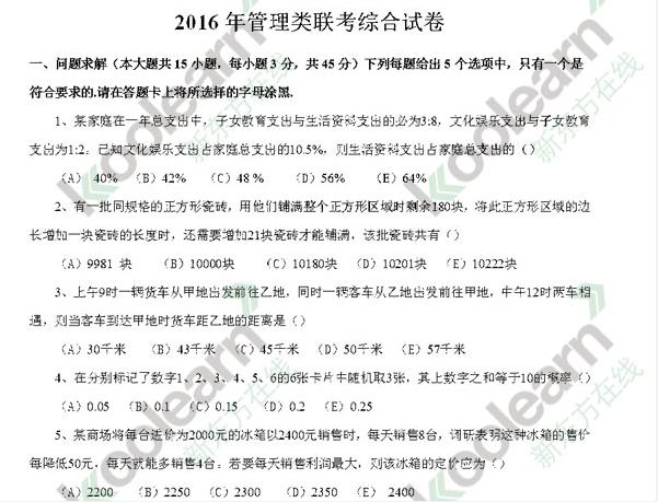 来源 : 新东方在线 12月26日 11:32 关键字 : 2016考研管理类联考数学真题及答案