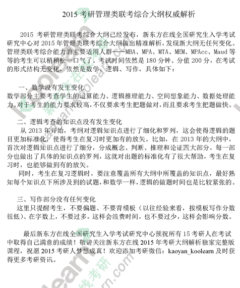2015考研大纲已发布,新东方在线考研频道第一时间收录整理了2015考研英语大纲,更多2015考研大纲下载关注2015考研大纲解析专题,新东方在线考研名师将为考生全方位解读2015考研大纲最...