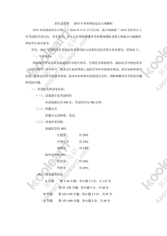 2015年考研专业课大纲发布,新东方在线名师第一时间权威解析大纲变化,指导考生后续复习规划和策略。希望考生对比新旧大纲,依据变化和解析重新调整复习侧重。下面是2015年西医综合考...