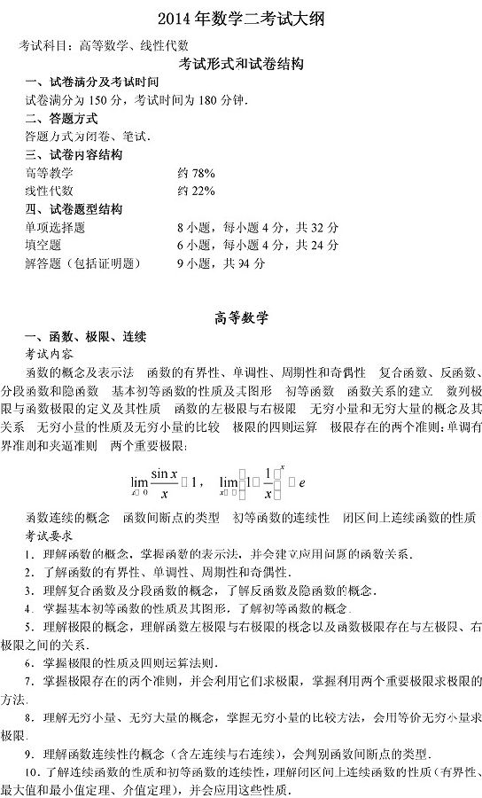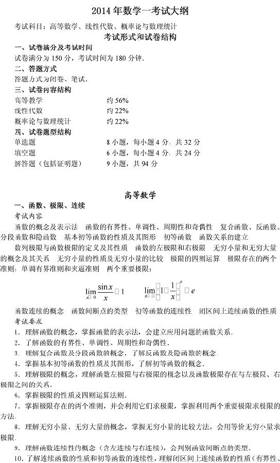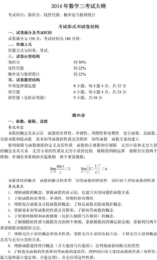 来源 : 网络 09月12日 15:24 关键字 : 2014考研数学大纲变化 考研数学大纲 考研大纲
