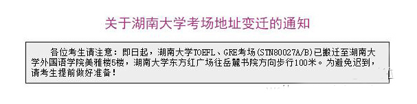 新东方在线托福网讯 各位托福考生们注意咯~湖南大学的TOEFL、GRE考场搬迁至湖南大学外国语学院美雅楼5楼啦~在湖南大学考试的小伙伴们千万不要走错考场,以免迟到哦!ETS官网湖南大学托福GRE...